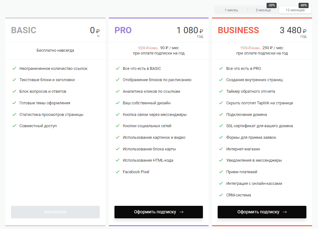 Тариф PRO подойдет, если: нужен одностраничный сайт (возможность создать уникальный дизайн, подключить кнопки, использовать HTML-коды) нужна аналитика посещений, кликов не требуется установка домена не требуется подключение оплаты не нужны внутренние страницы или товары не нужна форма сбора заявок
